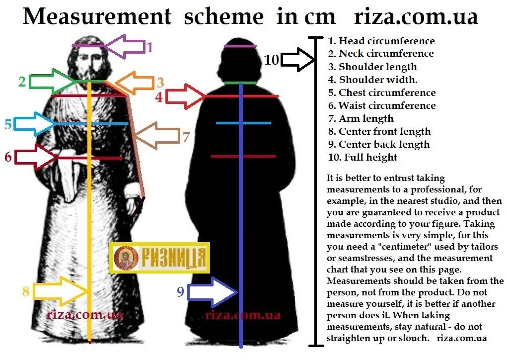 Для того, чтобы заказать индивидуальный пошив под облачение , вам необходимо снять мерки согласно шаблону замеров: